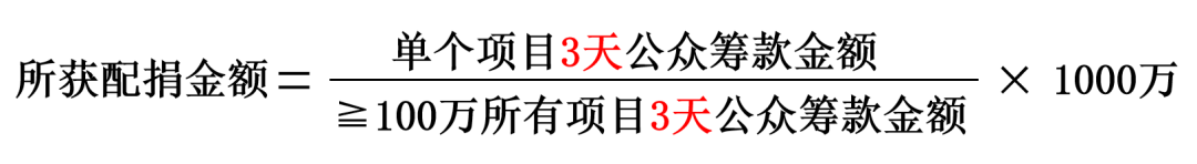 (2)面向公众筹款超100万项目(9月7日-9月8日):1000万非限定性配捐● 配捐使用方向:由获得配捐的公益慈善组织统筹,可用于组织运营与发展等非限定性方向;● 配捐规则:9月7日0:00至9月8日24:00期间,公众筹款金额≥100万元的项目,可获配捐资格。★ ≥100万所有项目指,9月7日0时至8日24时期间,公众筹款超100万的所有项目;★ 举个例子:如某公益项目截至8日24时公众筹款金额为120万,获得配捐资格,截至9日24时公众筹款金额为200万,则该公益项目所获配捐金额为:200万÷百万以上所有项目公众筹款金额×1000万。● 配捐使用方向:限用于行业成长培训、枢纽伙伴培育、99团队激励、第三方专业审计;● 达标条件:积极开展联合劝募的公募组织,满足联合组织数(含小微机构)≥30家、公众筹款额≥500万元、企业配出资金≥50万元(后两项均包括公募组织合作的非公募组织数据);● 配捐规则:在符合达标条件的公募组织中,根据公众筹款额排名,1-60名可获得不同金额的非限定性配捐。